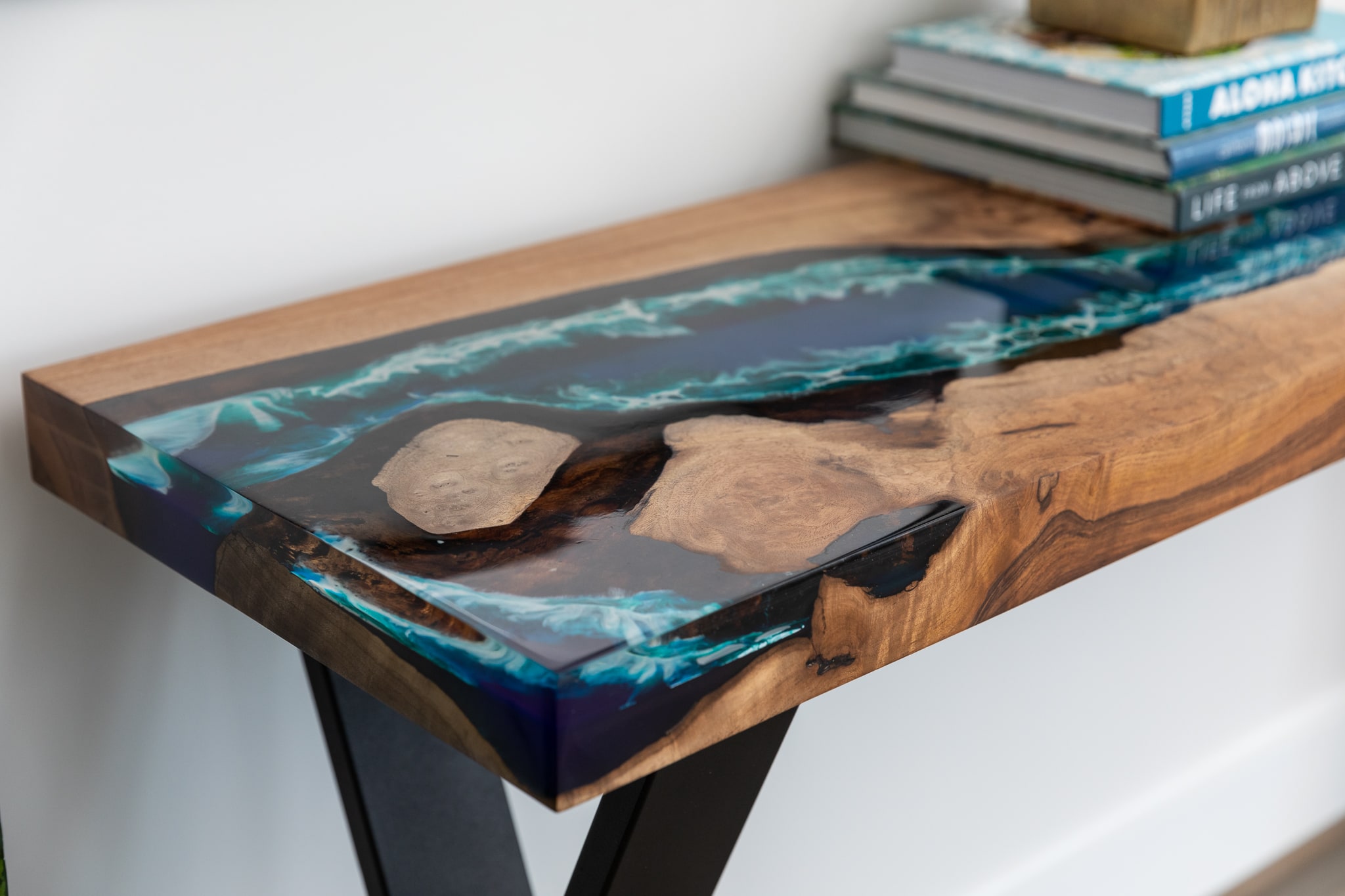 “I worked with a local artisan to create a custom table that had Hawaii and California Coast Vibes. I was able to select the species and shape of wood and pick the resin colors to capture the feeling of waves crashing.”