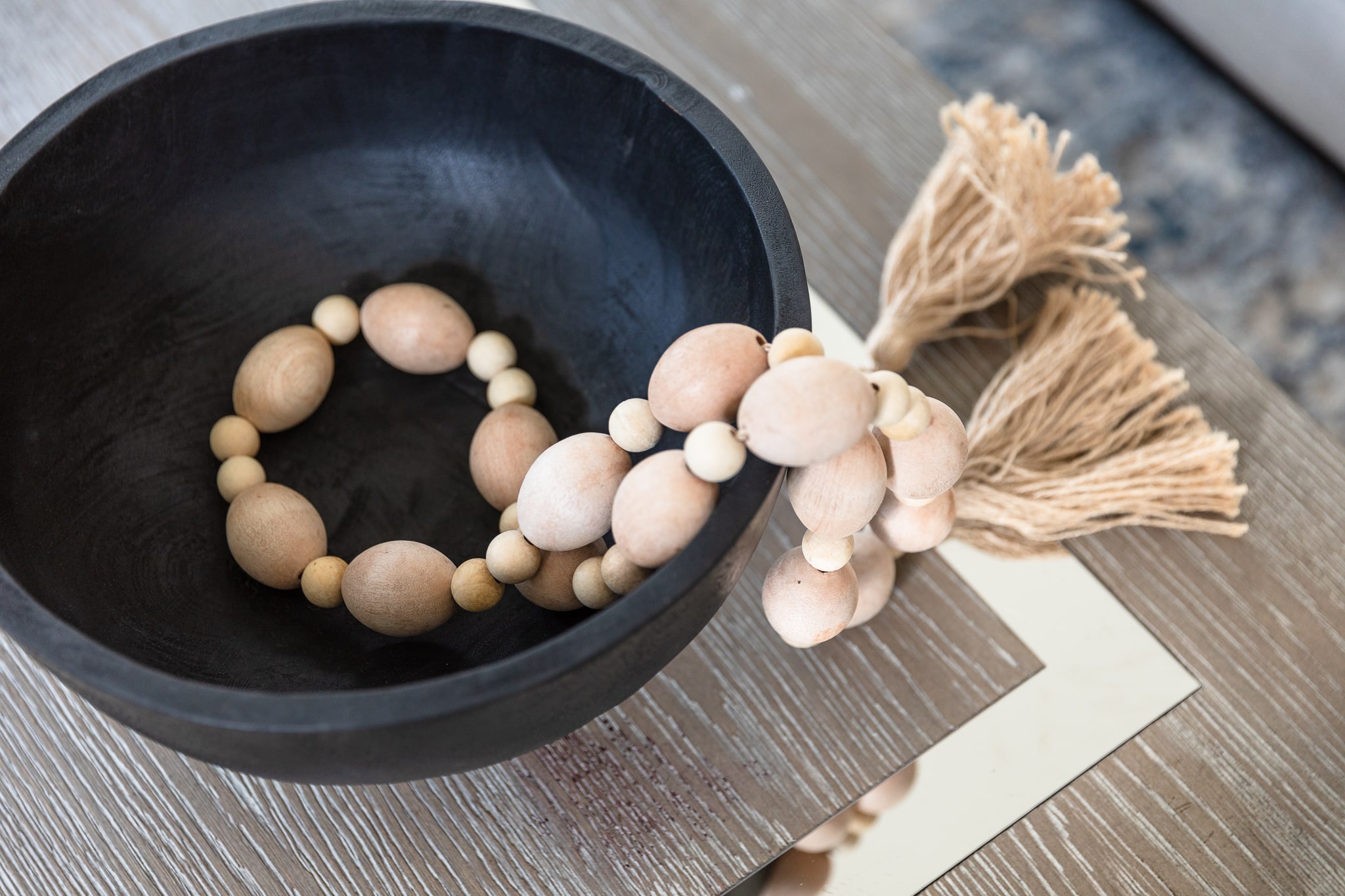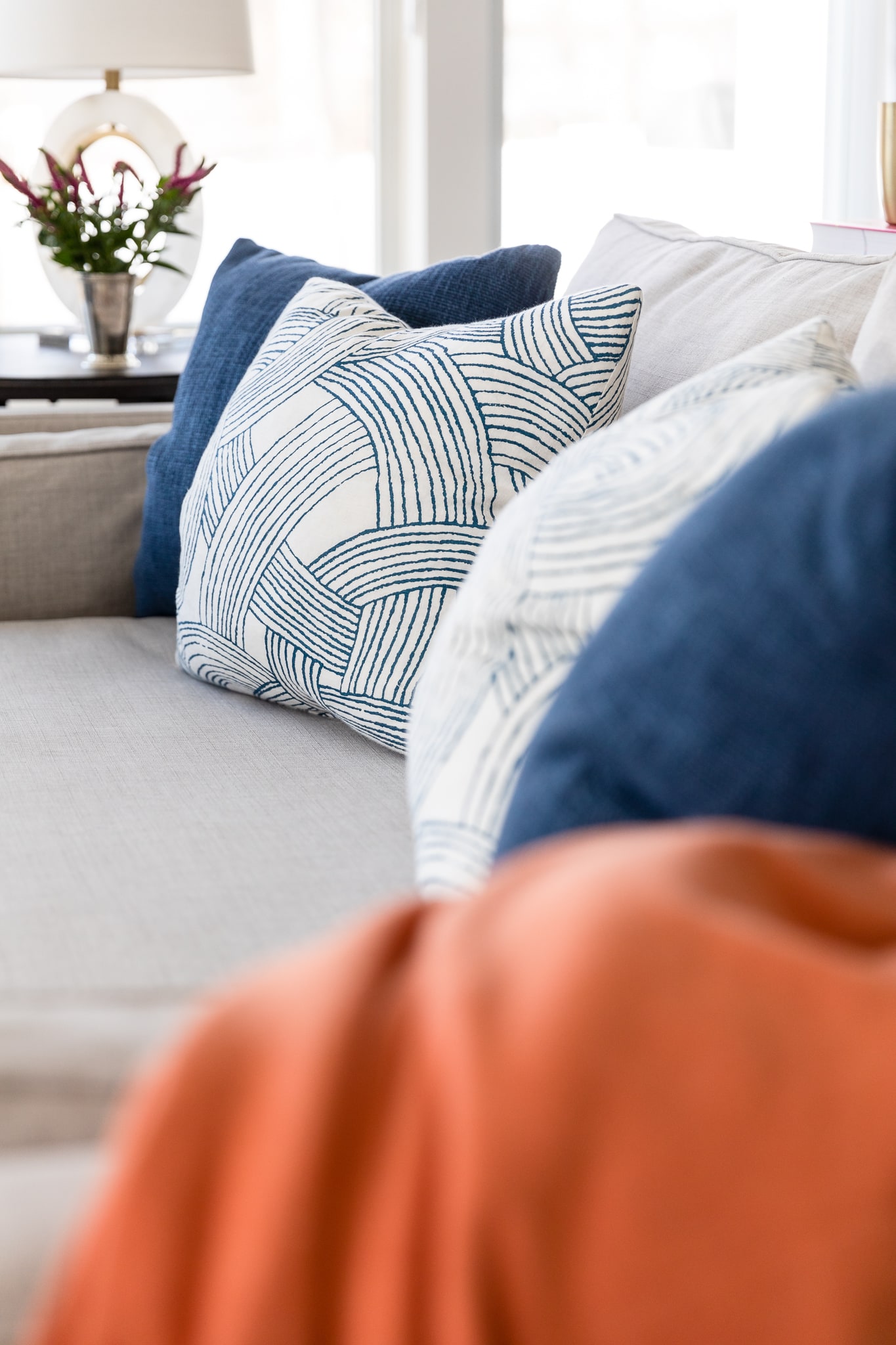 The selected patterns and textures give a subtle nod to the ocean and complement the overall color story. Unique pieces like the vase from El Salvador and the custom made table add meaning to the home.
