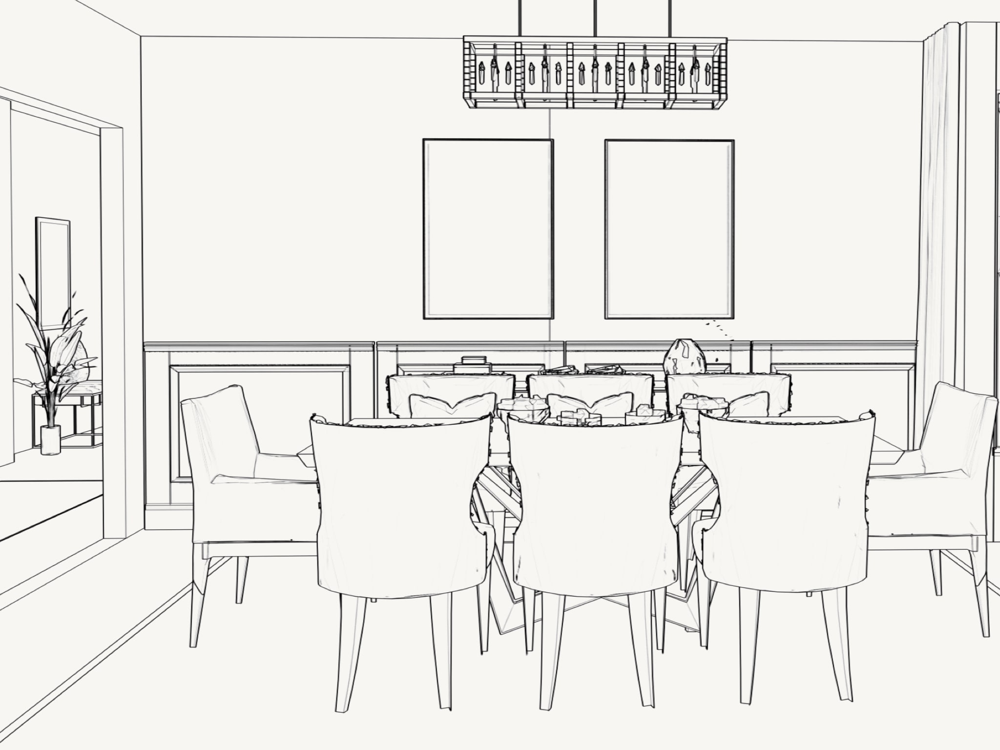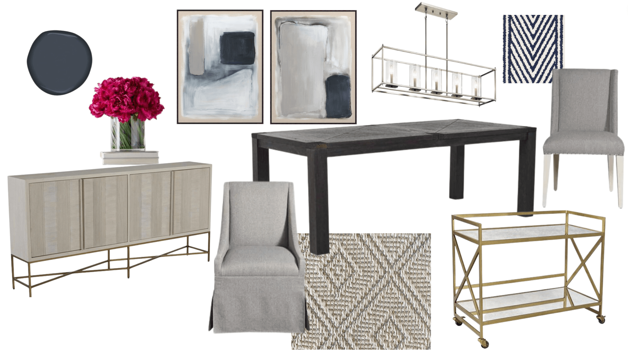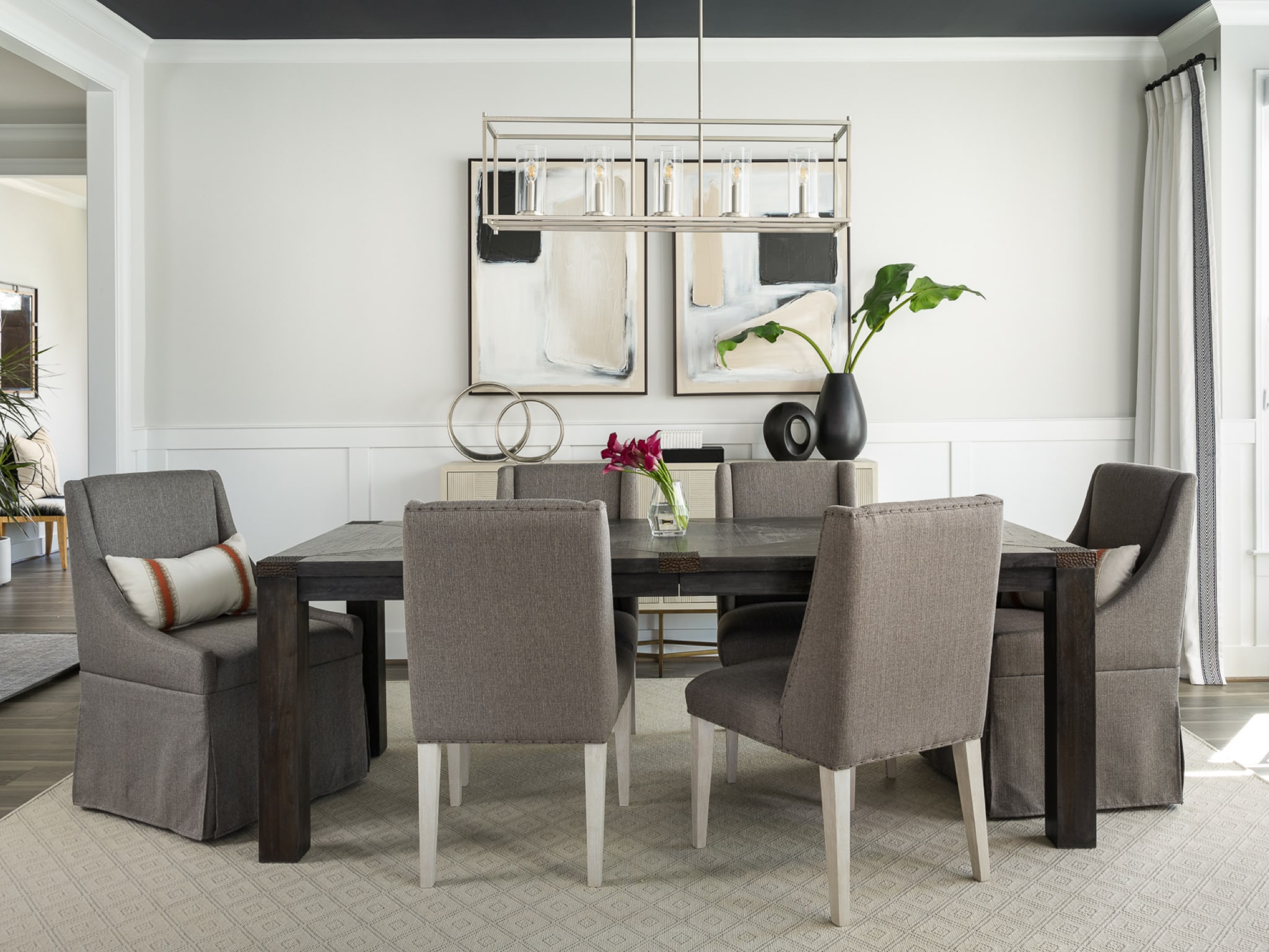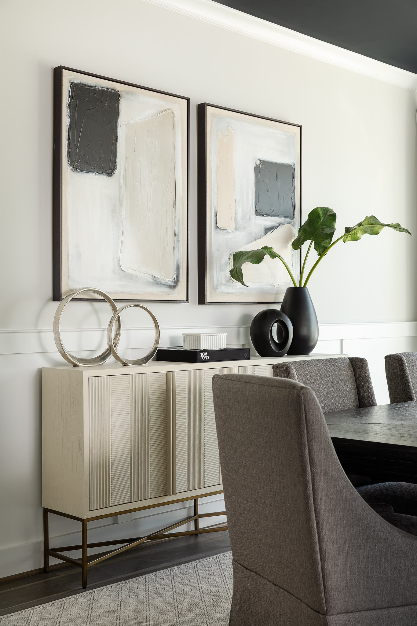 Dining room sideboard, paintings and decor